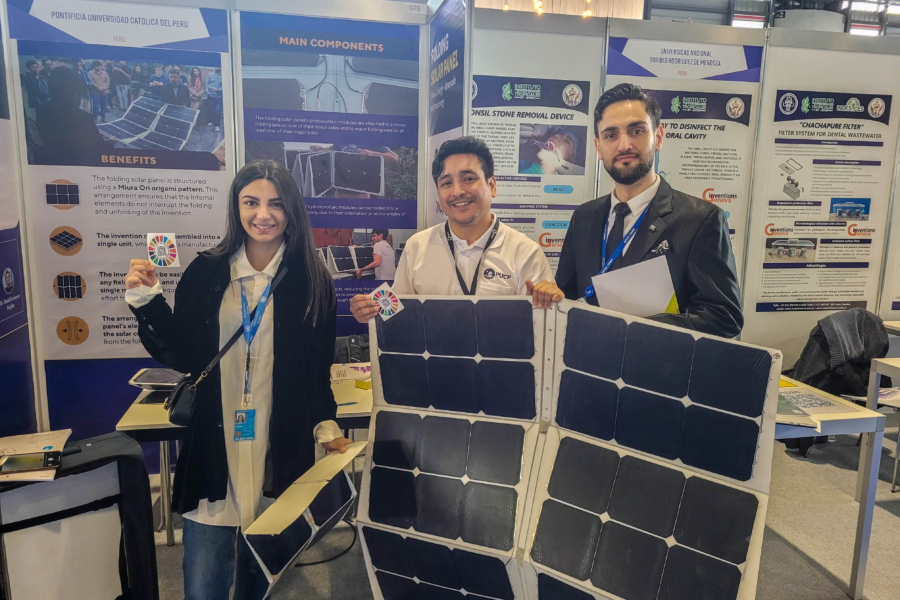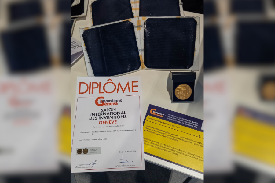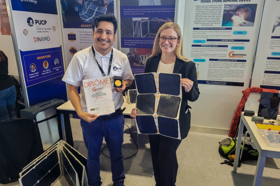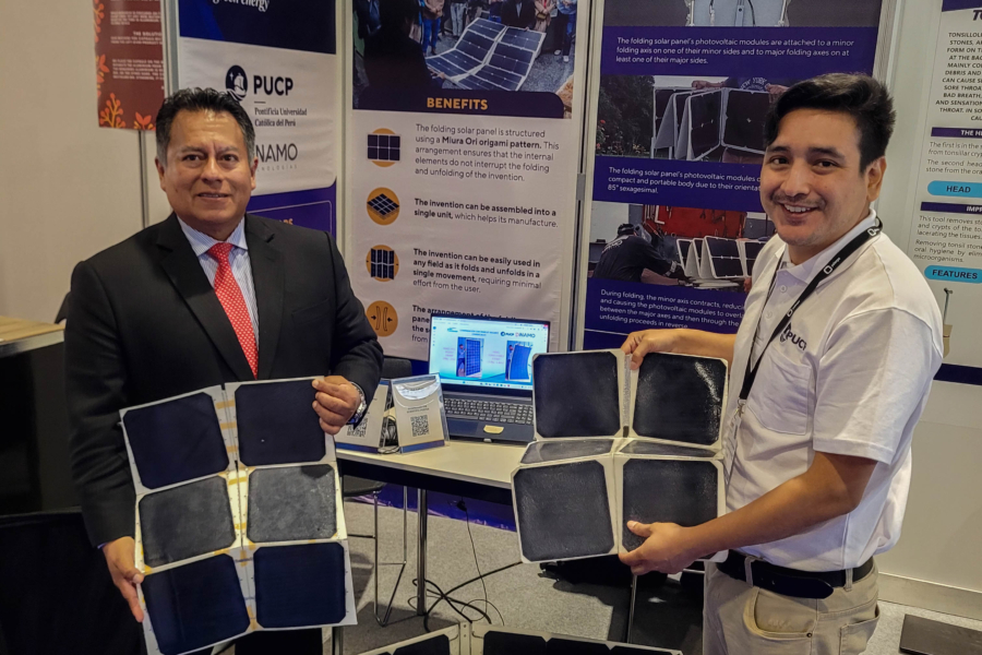 Enrique Pujada, docente de la sección de mecánica de nuestro Departamento de Ingeniería, representó a la PUCP en la 49ª edición de la Exposición Internacional de Inventos de Ginebra con el Panel Solar Plegable, proyecto apoyado desde la Oficina de Propiedad Intelectual del Vicerrectorado de Investigación, que busca a través de la técnica origami Miura-Ori, encontrar alternativas de energía renovable y funcional a la industria.