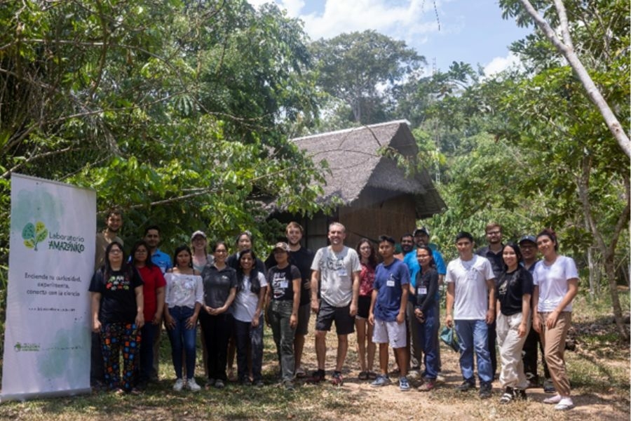 Figura 2. Equipo de la PUCP presente en las jornadas del Laboratorio Amazónico, junto con Saad Bhamla (izquierda) del Georgia Institute of Technology y Johana Reyes, directora de ASA.